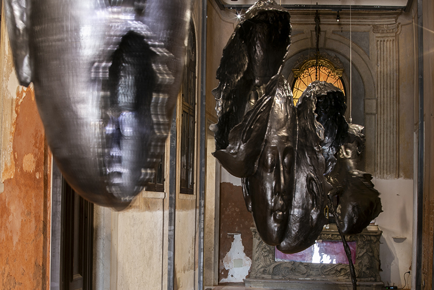 In the heart of Venice, next to Piazza San Marco, amid the city’s buzzing crowds and busy canals, lies an exhibition whose dim lighting and tranquil, almost otherworldly atmosphere offer a contemplative escape. At the intersection between the material and the metaphysical, Transcendence is a site-specific installation featuring four large-scale titanium sculptures suspended from the chapel ceiling. Guiding visitors from noise and conflict to tranquility, the journey through the exhibition symbolises rebirth, creating space for introspection.