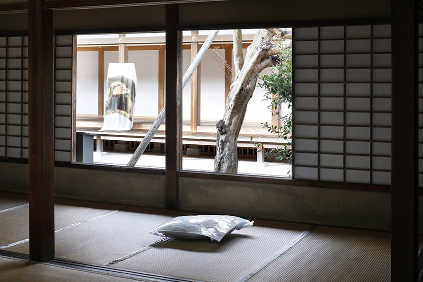 Responding to Manshu-in’s porous spatial boundary between the inside and the outside, Yamaoka guides the viewer by employing the toggling perspectives of looking into and out of, from a distance and close-up. Her works, partially exposed to the elements, catch the intensity of sunlight and shadows at different times of the day, reflect what lies beyond through changing air currents and wind, and coalescing perception with the viewer’s internal rhythm.