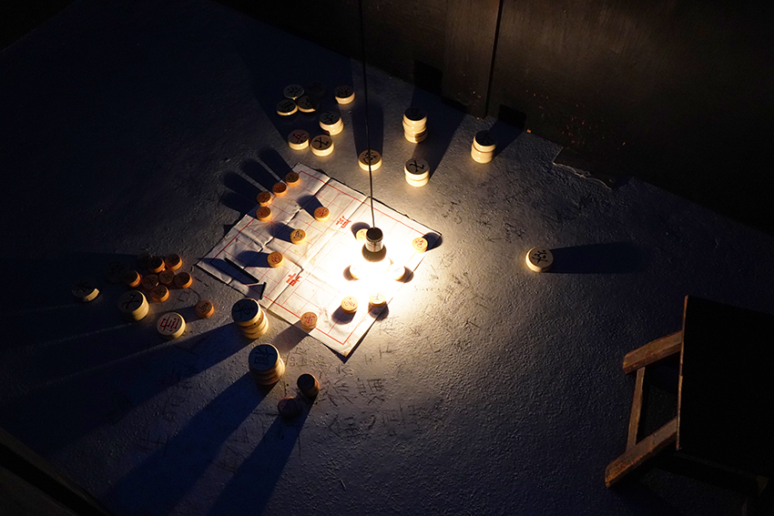 In Chan’s videos, the residents are similar; in the exhibition, we meet and learn a little about their lives through videoed interviews inside the small homes in which they live. Another, shorter video filmed on the street gives, I suppose, a context of abstracted alienation. Inside the completely black-walled, labyrinth-like, partitioned rooms, the exhibition also includes photographs, text, hanging dimmed lights, an illuminated kitchen pot and various publications to read (including the “transcript” of a dream), and a Chinese chess game in progress on the ground amid graffiti/scribblings on the floor. At the exhibition entrance is a large hand-written “reminder notice” written on a small table top: